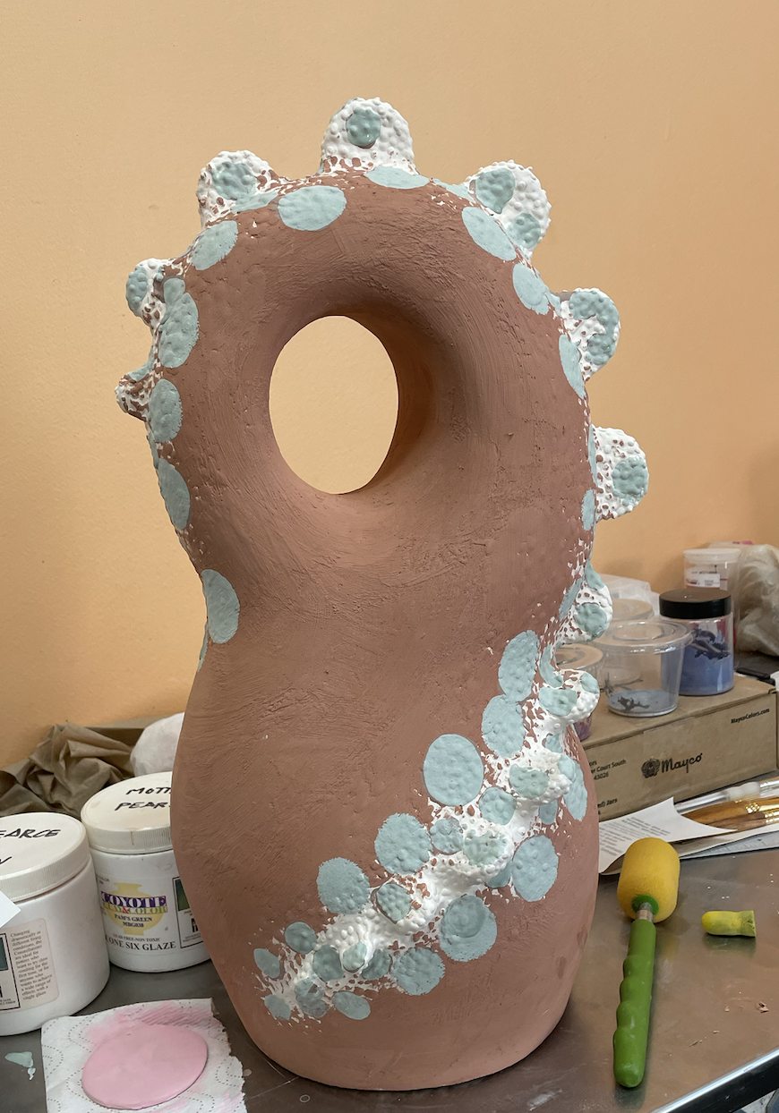 This series of three coil-built ceramic vessels explores psychological themes of attachment, specifically the development and effects of over-accommodation in relationships. Drawing from the “Chameleon Effect” which refers to the unconscious mimicry of social cues. The vessels utilize abstracted reptilian forms and symbolic openings to represent mimicry, self-erasure, and eventual self-preservation. The first vessel evokes the beginning stage of people-pleasing within co-dependent dynamics, its form referencing an egg-like origin. The second, more overtly chameleon-like, reflects the intensification of mimicry and growing internal discomfort. The final vessel symbolizes a tentative emergence from this cycle: upward-reaching horns denote boundary-setting, while inward-curled limbs reveal the ongoing struggle to maintain autonomy. Together, the vessels reflect identity shaped and strained by external validation and internal conflict.