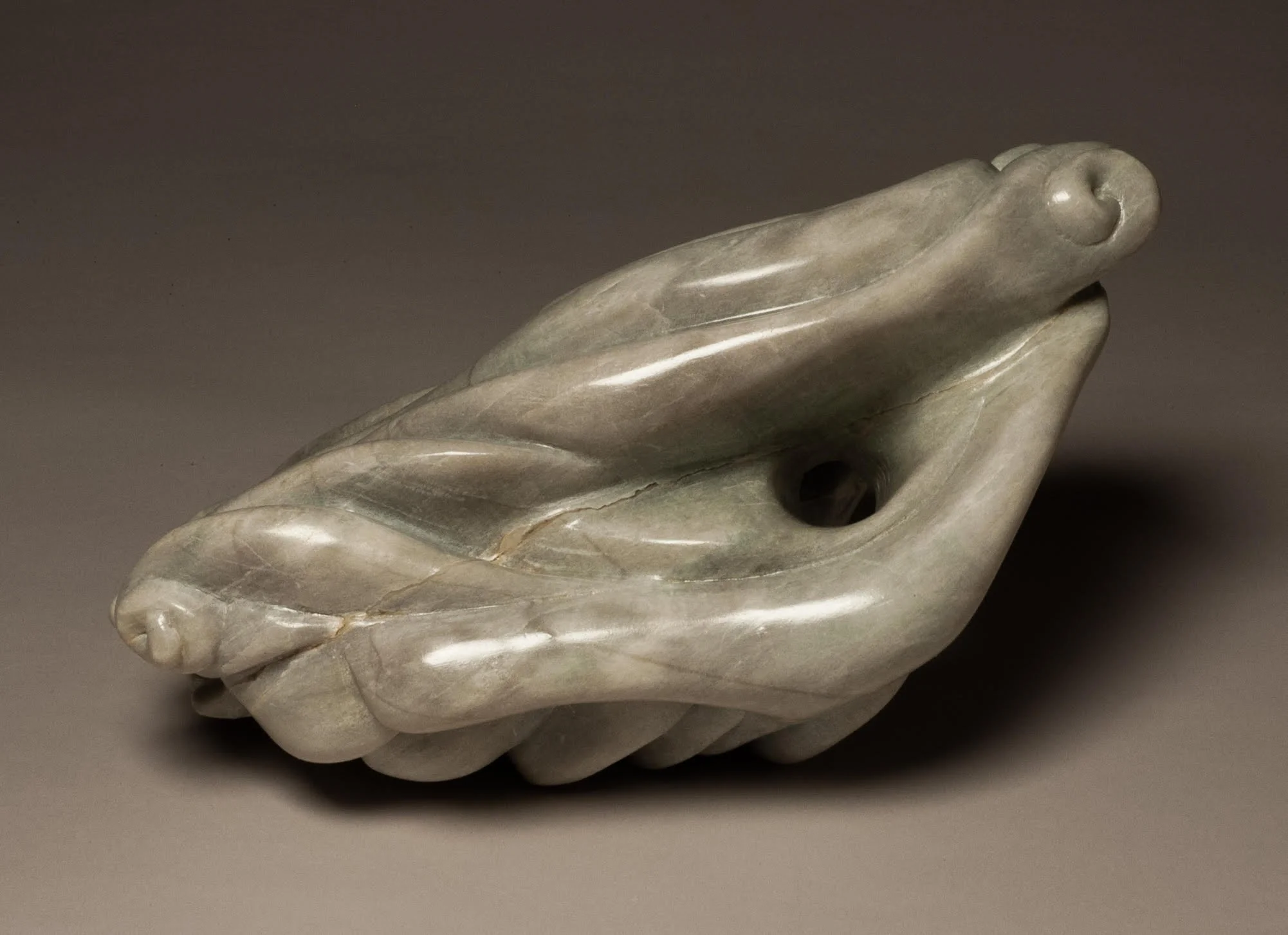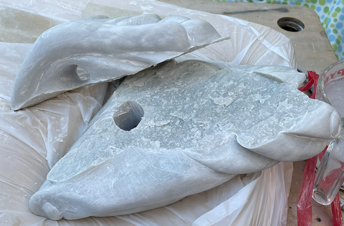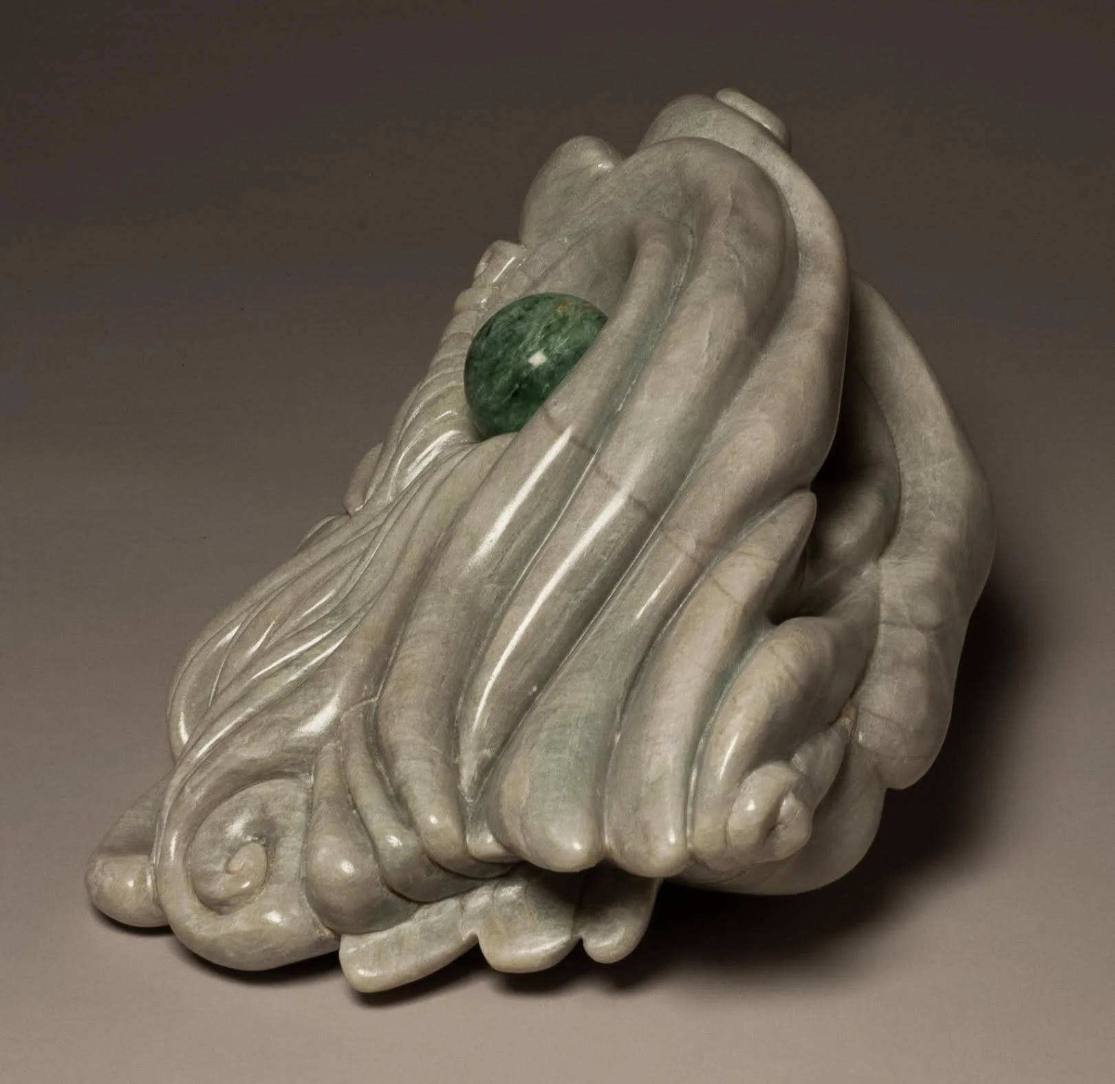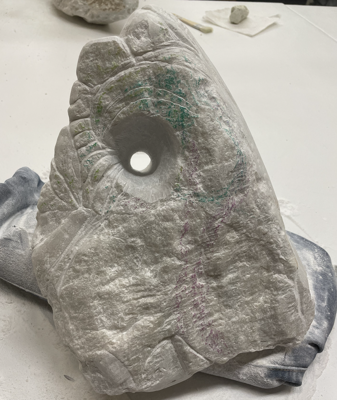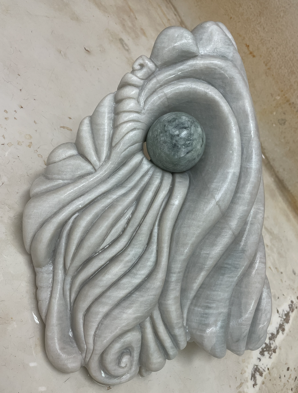 This sculpture blends ancestral reverence, natural symbolism, and organic motion. Inspired by Neolithic Irish carvings and hag stones, the work features swirling, asymmetrical lines and pierced forms that flow across the stone’s surface, reflecting themes of continuity, ritual, and change. Carved from white soapstone and accented with a contrasting smaller stone, the piece is meant to be viewed in the round, evoking movement and transformation from every angle. While rooted in Celtic visual language and personal heritage, it invites open interpretation. The carving process—meditative, yet marked by fracture and repair—mirrors the emotional resilience layered within the stone itself.